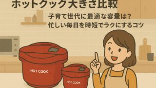 調理家電 ホットクック大きさ比較|子育て世代に最適な容量は?忙しい毎日を時短でラクにするコツ ホットクックの大きさ比較!1.0L・1.6L・2.4Lの違いを徹底解説。人数目安や作り置き、最新モデルの機能を踏まえ、子育て世代に最適な容量の選び方を紹介します。 2025.09.12 調理家電